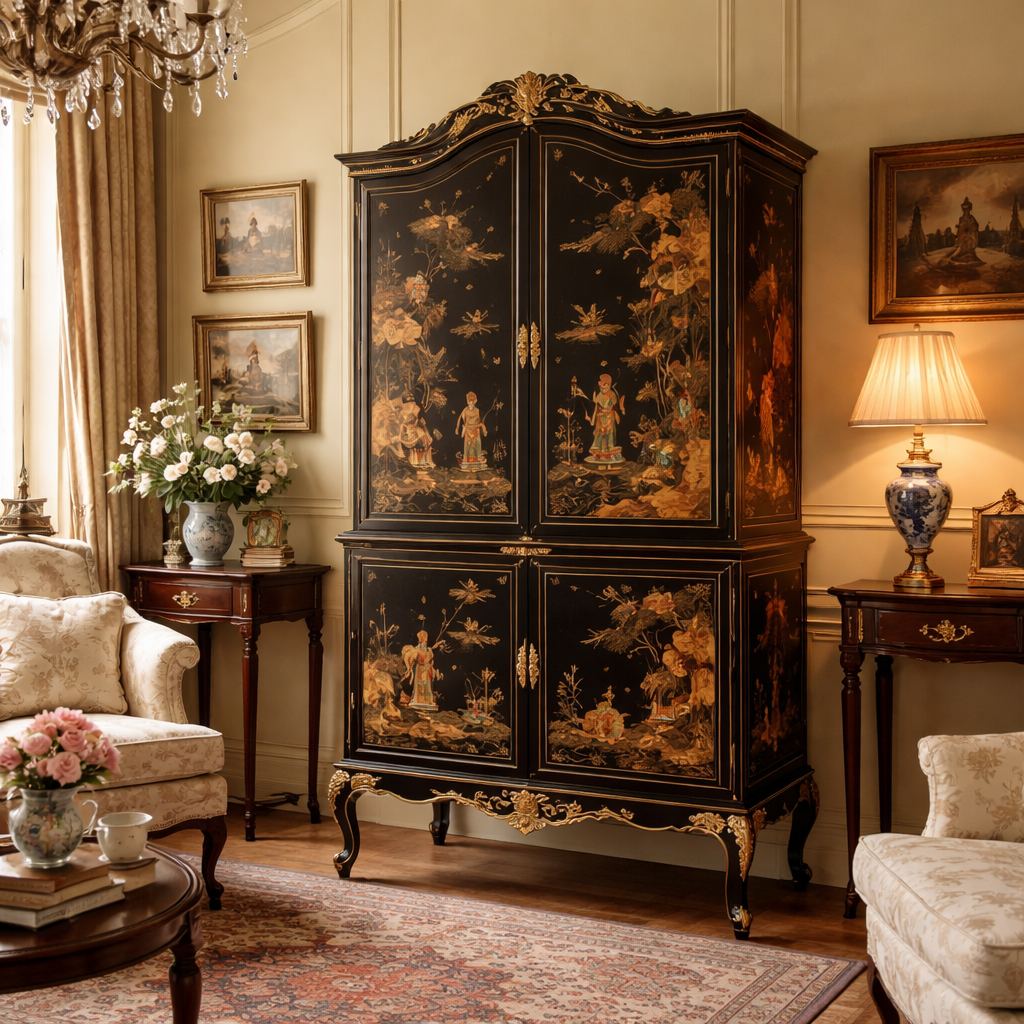 特に“ジャパニング”と呼ばれる漆風塗装は、日本や中国の漆器を模した英国独自の技法。